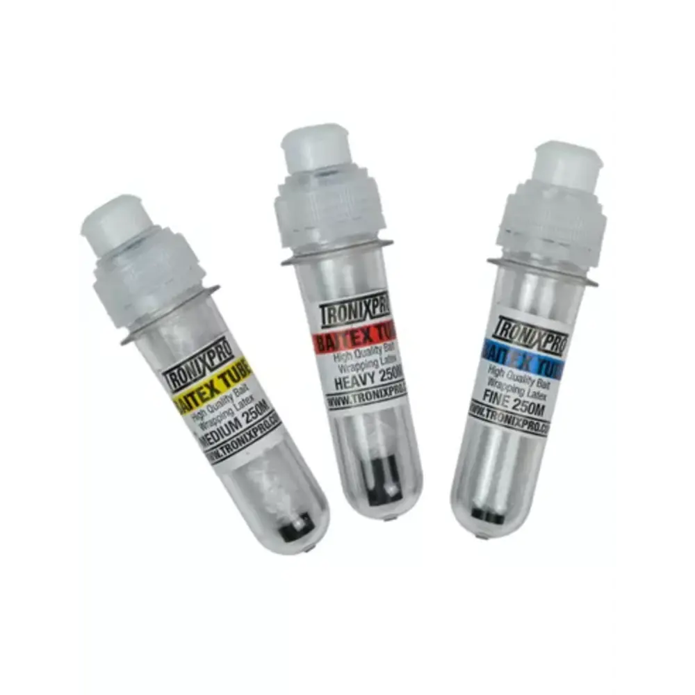 De Tronixpro Baitex is een superrekbaar en sterk latex bait-elastiek, beschikbaar in fijn, medium en heavy varianten, geleverd op 500 meter spoelen in een beschermende plastic houder.
